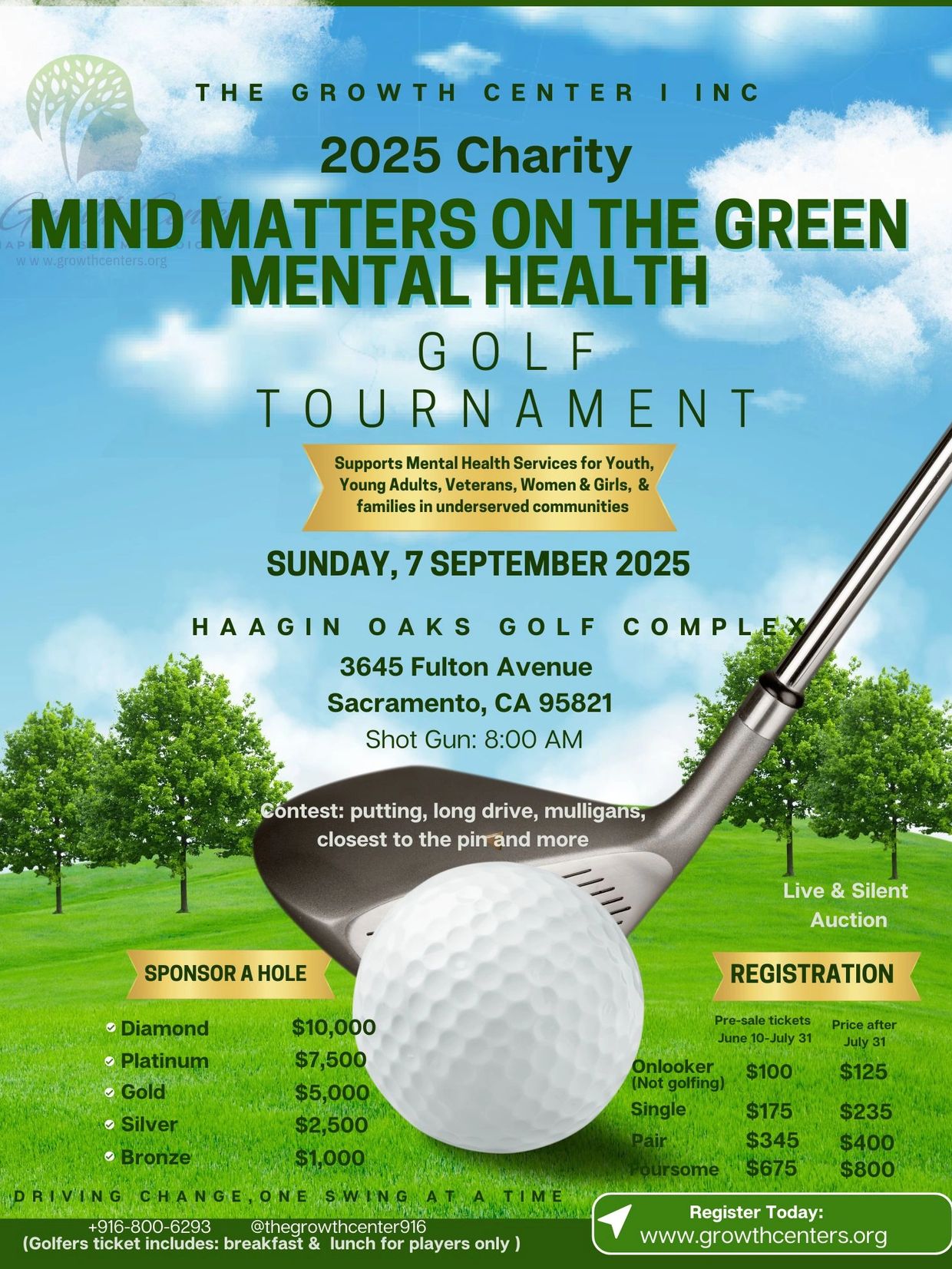 The Growth Center Charity Golf Tournament exists to drive awareness, advocacy, and action around mental health, Substance prevention, suicide awareness and emotional wellness in our communities. Through this spirited and inclusive event, we raise vital funds to support culturally responsive mental health education, youth leadership programs, and trauma-informed healing initiatives. Our mission is to unite partners, professionals, and everyday champions on the green—so together, we can grow stronger, healthier, and more resilient communities for generations to come.